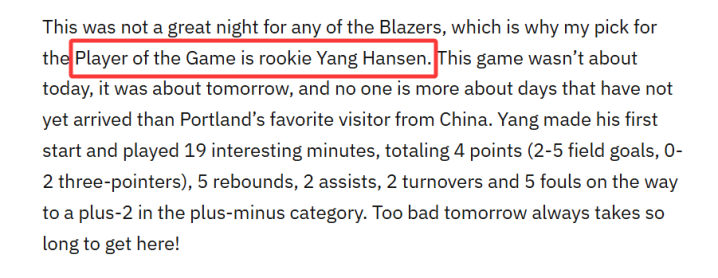 Blazer's Edge的解释是:“对开拓者全队而言,今晚的表现都难言出色,这也是我把本场最佳球员投给新秀杨瀚森的原因。这场比赛的意义本就不在于当下,而在于未来,而在波特兰东方汇赢,没人比这位来自中国的人气新星更能代表球队的未来。杨瀚森此役迎来生涯首次首发,登场19分钟的表现颇具看点:他全场5投2中、三分2投0中,拿下4分5篮板2助攻,同时出现2次失误和5次犯规,正负值为+2。只可惜,未来总是姗姗来迟!”
